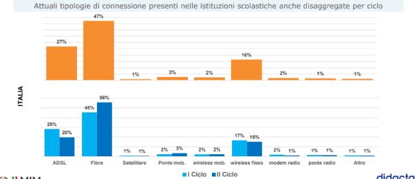 Parmi tous, le type de connexion le plus utilisé est la fibre, suivi de l'ADSL et du sans fil fixe. La pandémie a certainement eu une influence majeure sur la course aux écoles vers la numérisation. Ainsi, si au cours de l'année scolaire 2017/2018 seulement 23,4% des écoles pouvaient compter sur la fibre optique, pour l'année en cours, ce pourcentage s'élève même à 47,4 %.