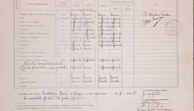 Un autre bulletin scolaire, datant des années 1920, montre les résultats d’un élève promu de la quatrième à la cinquième année. Même sans exceller, compte tenu des nombreuses entrées « suffisantes ». Surtout, deux se démarquent. La première, « Les femmes et le travail manuel », cela en dit long sur la vision de l’homme et de la femme dans la première moitié du XXe siècle. En particulier, la femme – considérée comme épouse et mère de famille – a rapidement commencé à se préparer à assumer ce rôle. C’est pourquoi, dès l’école, les petites élèves étaient appelées à en apprendre davantage sur le « travail des femmes », un sujet qui englobait divers domaines liés au soin et à l’organisation de la vie domestique, en particulier la couture, la broderie et la couture. Tout comme pour les garçons, il y avait l’application d’un travail « manuel », c’est-à-dire tout ce qui concerne l’entretien pratique du jardin et de la maison. Parallèlement, les étudiants étaient également appelés à démontrer des ambitions artistiques. Comment ne pas observer cette voix particulière qui évalue la lecture et le jeu expressifs (aux côtés du chant et de la belle écriture). Ici, même notre bébé a obtenu un « bien » au deuxième trimestre.